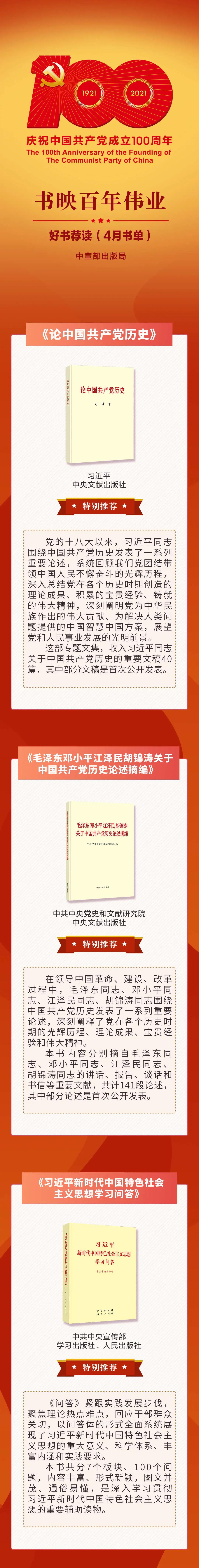 為(wèi)慶祝中國(guó)共産黨成立100周年(nián),中共中央宣傳部出版局聯合有關單位和部門(mén)開(kāi)展“書映百年(nián)偉業(yè)——慶祝中國(guó)共産黨成立100周年(nián)好書薦讀(dú)”活動,于2021年(nián)4月(yuè)—12月(yuè),每月(yuè)向全社會(huì)公布當月(yuè)推薦書單。4月(yuè)書單,一(yī)起來看(kàn)↓↓↓