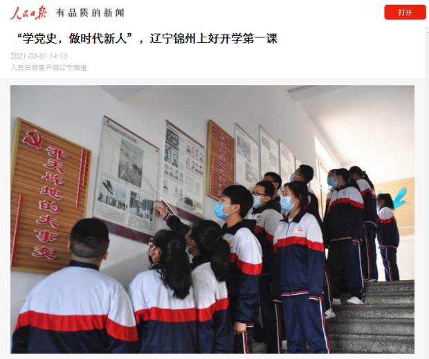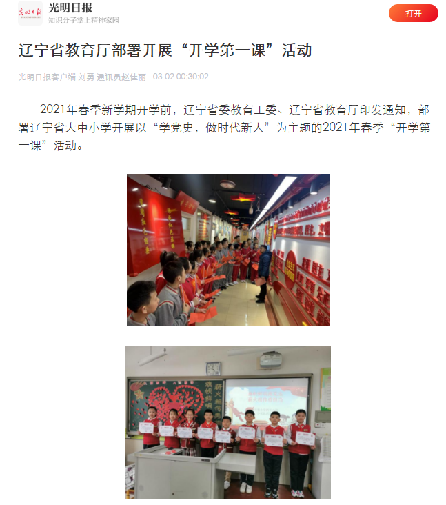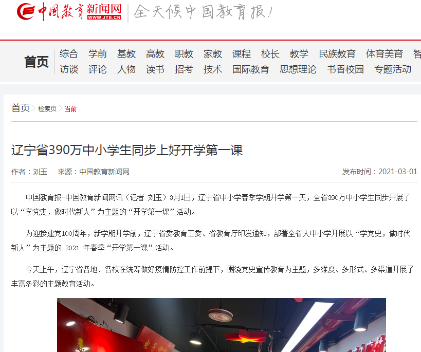 遼甯省各地、各校以“學黨史,做時代新人”為(wèi)主題,多(duō)維度、多(duō)形式、多(duō)渠道開(kāi)展2021年(nián)春季“開(kāi)學第一(yī)課”活動。相(xiàng)關内容經各級媒體報(bào)道後,引發廣泛關注。遼甯省在全國(guó)率先組織學生(shēng)在開(kāi)學第一(yī)課學黨史,做時代新人,緊跟時代,别具特色,取得了較好的宣傳效果,同時也為(wèi)迎接中國(guó)共産黨成立100周年(nián)營造了良好的輿論氛圍。