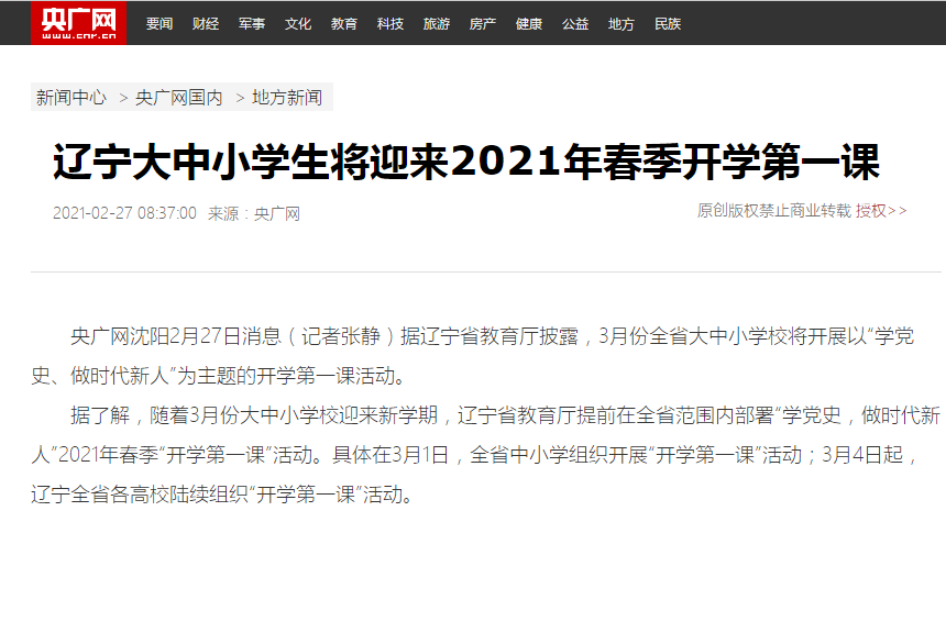 遼甯省“開(kāi)學第一(yī)課”引起社會(huì)廣泛關注