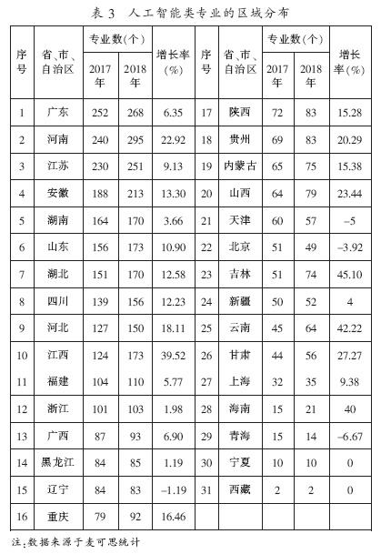 從(cóng)三大經濟區域分布來看(kàn),2017年(nián)西(xī)部地區省、市(shì)、自(zì)治區人工(gōng)智能(néng)類專業(yè)布點數為(wèi)677個(gè),2018年(nián)為(wèi)780個(gè),增長(cháng)率為(wèi)15.21%;2017年(nián)中部地區省、市(shì)、自(zì)治區人工(gōng)智能(néng)類專業(yè)布點數為(wèi)1 128個(gè),2018年(nián)為(wèi)1 217個(gè),增長(cháng)率為(wèi)7.89%;2017年(nián)東部地區省、市(shì)、自(zì)治區人工(gōng)智能(néng)類專業(yè)布點數為(wèi)931個(gè),2018年(nián)為(wèi)1 100個(gè),增長(cháng)率為(wèi)18.15%。2018年(nián),專業(yè)布點數較多(duō)的省份為(wèi)河南(nán)、廣東和江蘇,分别為(wèi)295個(gè)、268個(gè)和251個(gè);專業(yè)布點數增速較快的省份為(wèi)吉林、雲南(nán)和甘肅,分别為(wèi)45.1%、42.22%和39.52%;專業(yè)布點數出現負增長(cháng)的省份有青海、天津、北(běi)京、遼甯,分别為(wèi)-6.67%、-5%、-3.92%、-1.19%,如表3所示。