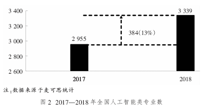 對2017—2018年(nián)全國(guó)人工(gōng)智能(néng)類專業(yè)5個(gè)類别14個(gè)專業(yè)的相(xiàng)關數據進行統計分析。從(cóng)專業(yè)布點數來看(kàn),2017年(nián)全國(guó)高(gāo)職人工(gōng)智能(néng)類專業(yè)數為(wèi)2 955個(gè),2018年(nián)為(wèi)3 339個(gè),增長(cháng)率為(wèi)13%,是增長(cháng)最快的專業(yè)類别,如圖2所示。
