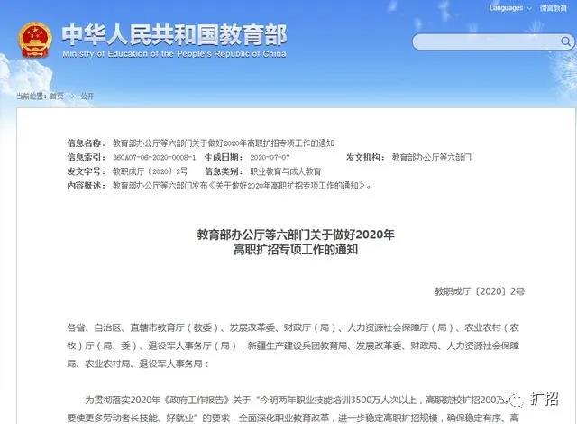 早在七月(yuè)初,我國(guó)教育部、國(guó)家發展改革委等六部門(mén)聯合下(xià)發《關于做好2020年(nián)高(gāo)職擴招專項工(gōng)作的通(tōng)知》,要求各地全面深化職業(yè)教育改革,進一(yī)步穩定高(gāo)職擴招規模,确保穩定有序、高(gāo)質量地完成2020年(nián)高(gāo)職擴招專項工(gōng)作。