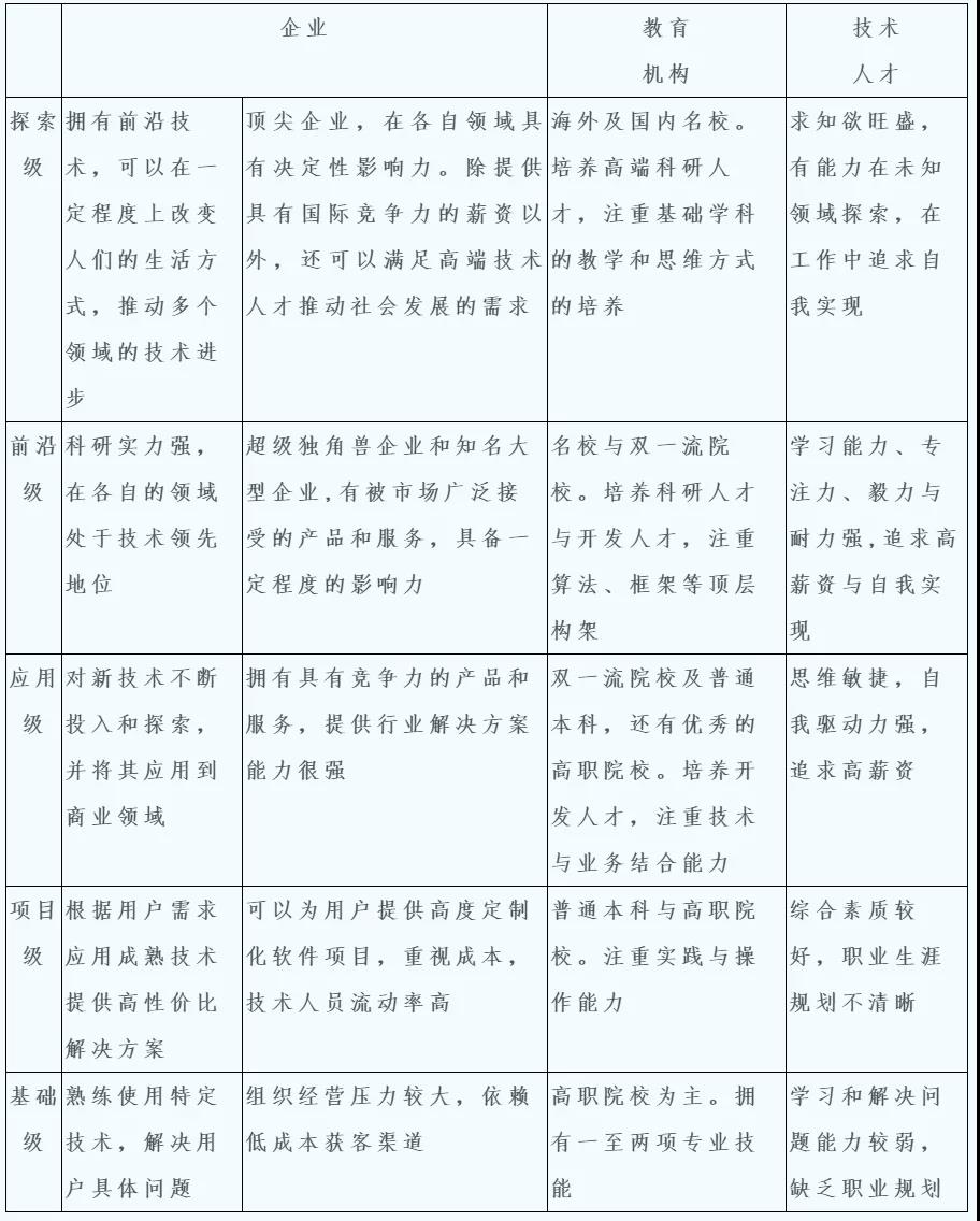 中國(guó)軟件(jiàn)行業(yè)協會(huì)教育與培訓委員(yuán)會(huì)研究團隊在調研中發現,軟件(jiàn)和信息技(jì)術(shù)服務業(yè)領域具有多(duō)種與傳統領域不同的特點:技(jì)術(shù)更新換代速度快,從(cóng)業(yè)人員(yuán)需要保持時刻學習的狀态;對熟練度的要求較低(dī),從(cóng)業(yè)者的能(néng)力更多(duō)與其所具備的知識、經驗相(xiàng)關;技(jì)術(shù)能(néng)力對企業(yè)至關重要,頭部企業(yè)都會(huì)采取科技(jì)主導的發展戰略;互聯網産品與軟件(jiàn)産品受地域限制小(xiǎo),具有領先技(jì)術(shù)的企業(yè)很容易在全國(guó)範圍内獲得極大市(shì)場份額,從(cóng)而使公司得以迅猛發展;優秀的互聯網與軟件(jiàn)産品可以極大地改善人們的娛樂、工(gōng)作與生(shēng)活,促進社會(huì)發展進步。基于此特點,軟件(jiàn)和信息技(jì)術(shù)服務業(yè)行業(yè)有非常強的“滾雪球”效應,領先企業(yè)具有經濟優勢能(néng)廣泛吸納高(gāo)端人才,這些人才為(wèi)企業(yè)奠定領先的技(jì)術(shù)地位,領先技(jì)術(shù)可以迅速為(wèi)企業(yè)帶來利潤,并吸引更多(duō)優秀的技(jì)術(shù)人才加入。因此,企業(yè)對人才的競争格外激烈,領先的企業(yè)不遺餘力吸引高(gāo)端人才來确保自(zì)己的技(jì)術(shù)優勢,實力較差的企業(yè)則選取不同的商業(yè)模式,退出技(jì)術(shù)領域的競争。根據企業(yè)實力,由強到(dào)弱分為(wèi)五個(gè)層級:探索級、前沿級、應用級、項目級、基礎級。每個(gè)層級企業(yè)的經營目标、策略與用人方案各不相(xiàng)同。而五個(gè)層級的企業(yè)又(yòu)分别對應不同層級的高(gāo)等院校,企業(yè)、教育機(jī)構與人才呈現層級對應關系。這種層級對應關系是繪制人才體系矩陣的基礎。
