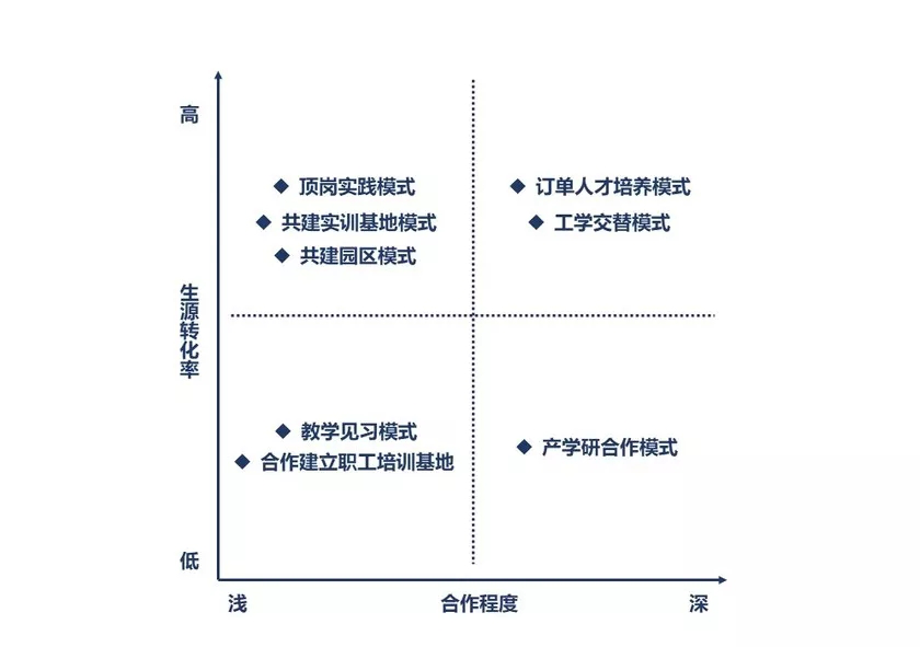 1.“園區型”校企合作:以政府為(wèi)主導的公共實訓基地合作模式,融合了職業(yè)培訓、職業(yè)資格鑒定、創業(yè)實訓等諸多(duō)功能(néng),部分省市(shì)還(hái)将其與此前的創業(yè)園、産業(yè)園等各類形态的大學科技(jì)園進行集成,試圖連通(tōng)創新、孵化、創業(yè)、培訓、就(jiù)業(yè)等多(duō)條分支路(lù)徑。它衍生(shēng)于“一(yī)校多(duō)企”多(duō)邊組合結構下(xià)的校企合作,且在形成校企合作新機(jī)制的過程中,蘊含了法律契約約束、成本分擔、融資體系、分配形式等諸多(duō)較為(wèi)典型的社會(huì)要素,并以社會(huì)化的形式實現自(zì)主式運轉。○法律契約約束、成本分擔、融資體系、分配形式等典型要素;○以開(kāi)放(fàng)、共享、公益為(wèi)标志(zhì)的終端形态。◎受限于運轉成本、社會(huì)容納量和開(kāi)放(fàng)性服務等諸多(duō)要素;◎較多(duō)地表現為(wèi)以院校為(wèi)主導的、相(xiàng)對封閉于校内的仿真或純消耗的實訓形态;◎實訓基地因定位于校内現有專業(yè)而決定了校企合作關系處于 1∶1 的單一(yī)結構;往往因校企合作的波動或中斷導緻實訓基地的存廢與閑置,而由政府主導的職業(yè)培訓基地因缺乏全真的學生(shēng)參與的實訓場景,存在培訓内容僵化、以考代訓的缺陷;傳統的合作模式未能(néng)有效地融合政、校、企的三方資源,衍生(shēng)了重複投資及浪費(fèi)人力資源等系列問題。