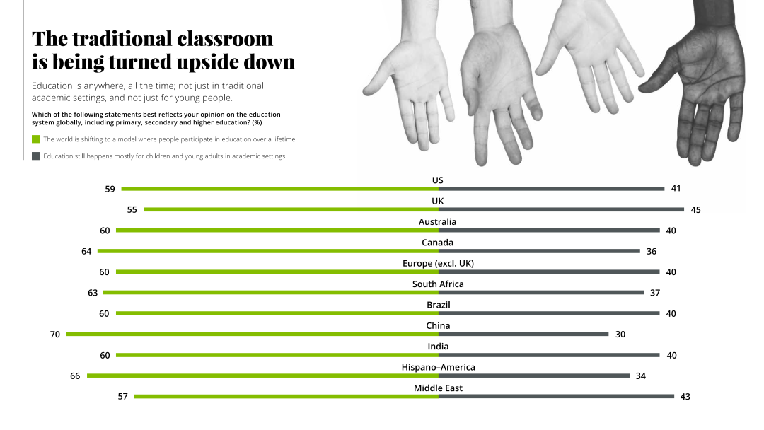 傳統教育暴露了越來越多(duō)的短闆,虛拟教育成為(wèi)新常态,碎片式學習成為(wèi)主流,終生(shēng)學習已經成為(wèi)現實…… 一(yī)場由學習者驅動的教育革命正在世界各地展開(kāi),“自(zì)助式學習”的觀念正在重塑教育! 今天我們一(yī)起來看(kàn)一(yī)下(xià),全球教育變革的六大趨勢。 2019年(nián)5月(yuè),皮爾森對來自(zì)19個(gè)國(guó)家的11,000名學習者開(kāi)展了問卷調查,這是世界上(shàng)少有的如此大規模的教育調查。 調查發現:世界各地的學習者仍然對教育抱有很大的信心,他們期待教育能(néng)夠幫助自(zì)己取得成功。但是,他們獲得教育的方式正在改變,他們不再完全依賴于傳統的教育機(jī)構,而是更願意對自(zì)身教育采取“DIY”的方式,除此之外,學習者都表達出終身學習的意願。 調查發現六大主要趨勢 01 “自(zì)助式學習”的觀念正在重塑教育 調查發現,一(yī)種“自(zì)助式”(Do-It-Yourself)的觀念正在重塑教育,人們相(xiàng)信學習将越來越多(duō)地成為(wèi)自(zì)助式服務,尤其是當他們走上(shàng)工(gōng)作崗位後需要知識更新時,這意味著(zhe),混合式、組合式、多(duō)元化和個(gè)性化的學習模式将成為(wèi)越來越多(duō)人的選擇。 02 終身學習已成現實 終身學習不再是一(yī)種理念,它已成現實。40年(nián)的職業(yè)生(shēng)涯時代已經成為(wèi)過去,取而代之的是終生(shēng)學習和多(duō)樣化的職業(yè)道路(lù)。 知識經濟的到(dào)來,傳統的、單一(yī)的職業(yè)路(lù)徑的方式已經過時。學習者需要的是能(néng)夠适應不斷變化的工(gōng)作世界,這就(jiù)意味著(zhe)他們将不斷地學習,且碎片式的學習成為(wèi)主流,這是因為(wèi)其目的已經變為(wèi)工(gōng)作驅動和變革變動下(xià)的學習。 03 數碼和虛拟學習将成為(wèi)新常态 人們已經接受技(jì)術(shù)成為(wèi)教育的一(yī)部分,技(jì)術(shù)可以提升學習體驗,已被視為(wèi)教育的未來。大多(duō)數受訪者認為(wèi),人工(gōng)智能(néng)(AI)和其它技(jì)術(shù)創新可以讓學習變得更有吸引力。 數碼和虛拟學習的另一(yī)個(gè)好處是,讓學習變得更加經濟、便捷、容易,學習的邊界進一(yī)步得到(dào)了拓展和延伸,不再局限于學校。 04 對傳統教育系統的信心正在動搖 來自(zì)世界各地的許多(duō)受訪者都表達出:傳統教育沒有提供更多(duō)幫助,即使沒有正規學曆和教育經曆,也無礙他們找到(dào)工(gōng)作。 許多(duō)國(guó)家的工(gōng)作者開(kāi)始選擇除高(gāo)等教育外的其它學習途徑 ,以期掌握新的技(jì)能(néng)。通(tōng)過參加短期課程、雇主或專業(yè)協會(huì)提供的進修課程、學位課程或自(zì)學來提高(gāo)自(zì)己的工(gōng)作水(shuǐ)平。接近一(yī)半的英國(guó)受訪者表示,會(huì)重新考慮是否接受傳統高(gāo)等教育,高(gāo)等教育并不能(néng)有效地幫助他們做好就(jiù)業(yè)準備。 05 軟技(jì)能(néng)比自(zì)動化更有優勢 雖然STEM教育備受矚目,但人們逐漸意識到(dào):人類獨有的人際技(jì)能(néng)将使人類優于人工(gōng)智能(néng),如創造力、獨創性、解決問題和批判性思維等軟技(jì)能(néng)。許多(duō)受訪者提出,大學需要更加專注于這些軟技(jì)能(néng),為(wèi)學生(shēng)進入職場做好充分準備。 06 網絡和校園欺淩使學校管理尤為(wèi)困難 調查結果顯示,現如今社交媒體和校園暴力加劇了學校安全問題的發生(shēng),84%的美國(guó)人認為(wèi)學校安全性遠(yuǎn)低(dī)于25年(nián)前,學校管理也變得極為(wèi)困難。 教育革命的挑戰 上(shàng)述調查顯示出的種種變化都可歸因于:新的人才經濟來臨所帶來非常規的職業(yè)道路(lù)和技(jì)術(shù)壟斷。新的時代将為(wèi)學習者打開(kāi)一(yī)個(gè)新的局面,使其以更便捷、更經濟的方式進行學習。參與調查的學習者表現出對技(jì)術(shù)和在線學習的熱愛,他們希望接受更多(duō)的職業(yè)教育和軟技(jì)能(néng)培訓。 面對新時代的新需求,世界各國(guó)應該建立一(yī)個(gè)更廣泛的教育生(shēng)态系統,以滿足學習者的學習需求。 大學可以為(wèi)成人提供更多(duō)接受短期課程和軟性課程的機(jī)會(huì);企業(yè)可以與教育機(jī)構合作,為(wèi)員(yuán)工(gōng)提供量身定做的培訓;教育公司可以利用技(jì)術(shù)來提高(gāo)教育的參與度和普及性;政府部門(mén)可以采取相(xiàng)應舉措,幫助學習者可以更經濟、更廣泛地獲取教育機(jī)會(huì)和教育資源。 通(tōng)過傾聽學習者的聲音(yīn),可以幫助全球引領新經濟的增長(cháng)。通(tōng)過教育改善生(shēng)活,21世紀的技(jì)術(shù)進步為(wèi)我們提供了人類曆史上(shàng)的最大機(jī)會(huì)。期待看(kàn)到(dào)共同實現的進步,使學習者的願景成為(wèi)現實。