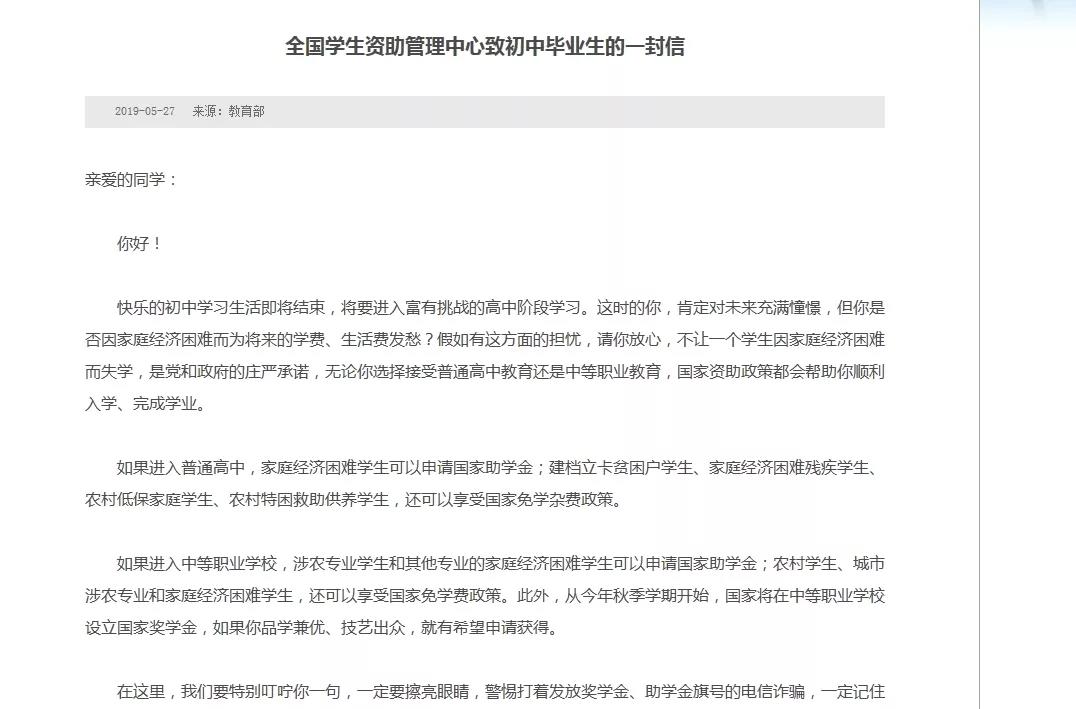 信中明确表示,高(gāo)中生(shēng)不但可以申請國(guó)家獎學金,部分還(hái)能(néng)享受國(guó)家免學雜(zá)費(fèi)用的政策。