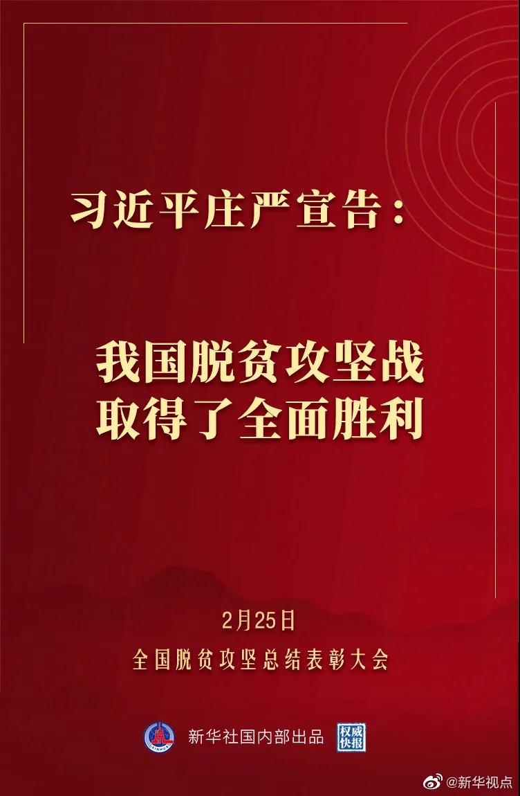 習近平在全國(guó)脫貧攻堅總結表彰大會(huì)上(shàng)發表重要講話,莊嚴宣告,經過全黨全國(guó)各族人民(mín)共同努力,在迎來中國(guó)共産黨成立一(yī)百周年(nián)的重要時刻,我國(guó)脫貧攻堅戰取得了全面勝利,現行标準下(xià)9899萬農村(cūn)貧困人口全部脫貧,832個(gè)貧困縣全部摘帽,12.8萬個(gè)貧困村(cūn)全部出列,區域性整體貧困得到(dào)解決,完成了消除絕對貧困的艱巨任務,創造了又(yòu)一(yī)個(gè)彪炳史冊的人間奇迹!這是中國(guó)人民(mín)的偉大光(guāng)榮,是中國(guó)共産黨的偉大光(guāng)榮,是中華民(mín)族的偉大光(guāng)榮!