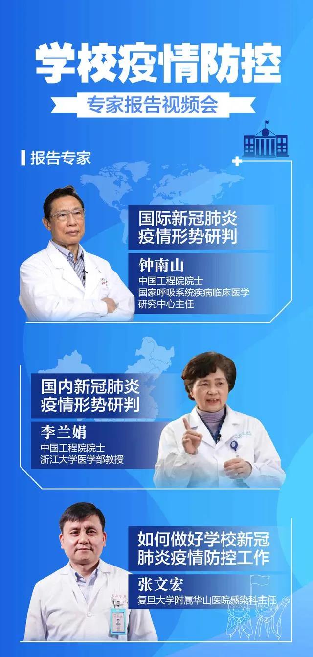 4月(yuè)20日,教育部召開(kāi)學校疫情防控專家報(bào)告視頻會(huì)。會(huì)上(shàng),中國(guó)工(gōng)程院院士鍾南(nán)山、中國(guó)工(gōng)程院院士李蘭娟、複旦大學附屬華山醫(yī)院感染科主任張文宏就(jiù)如何做好開(kāi)學後學校新冠肺炎疫情防控工(gōng)作等進行了專題報(bào)告。