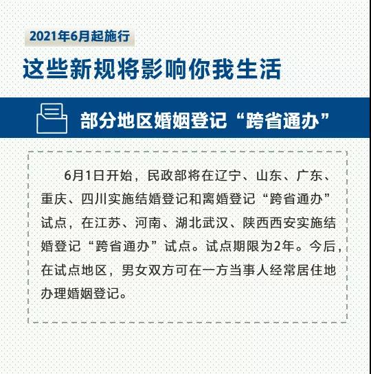 試點地區婚姻登記“跨省通(tōng)辦” ,學校不得隐瞞性侵未成年(nián)人等違法犯罪行為(wèi),對侵犯著作權行為(wèi)加大懲治力度……6月(yuè),這些新規将影響你我生(shēng)活